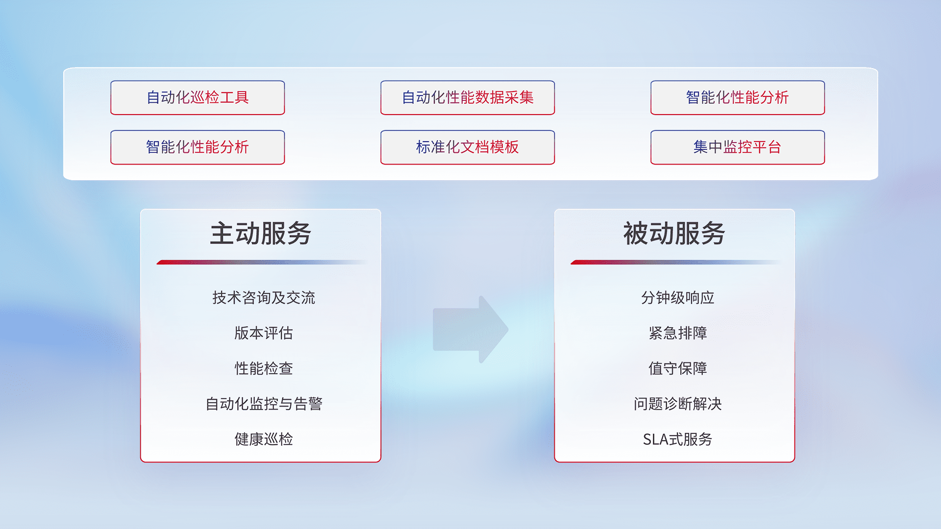 智能化工具和标准化文档,,,,保障服务质量,,,,提供主动服务(包含技术咨询、、版本评估、、、、性能检查、、自动化监控与告警、、、、健康巡检)和被动服务包含(分钟级响应、、、紧急排障、、、、值守保障、、问题诊断解决、、、、SLA服务)。。。